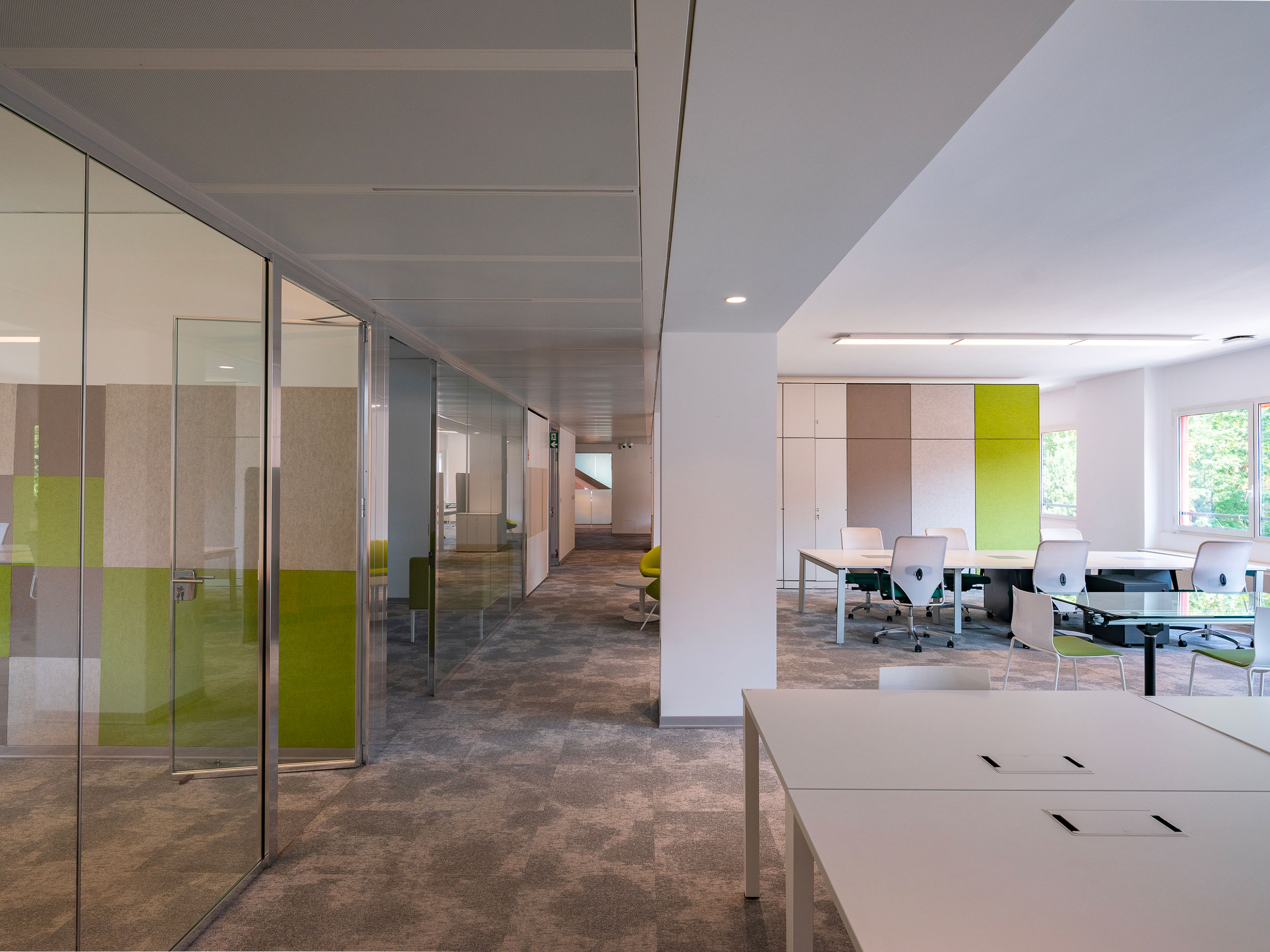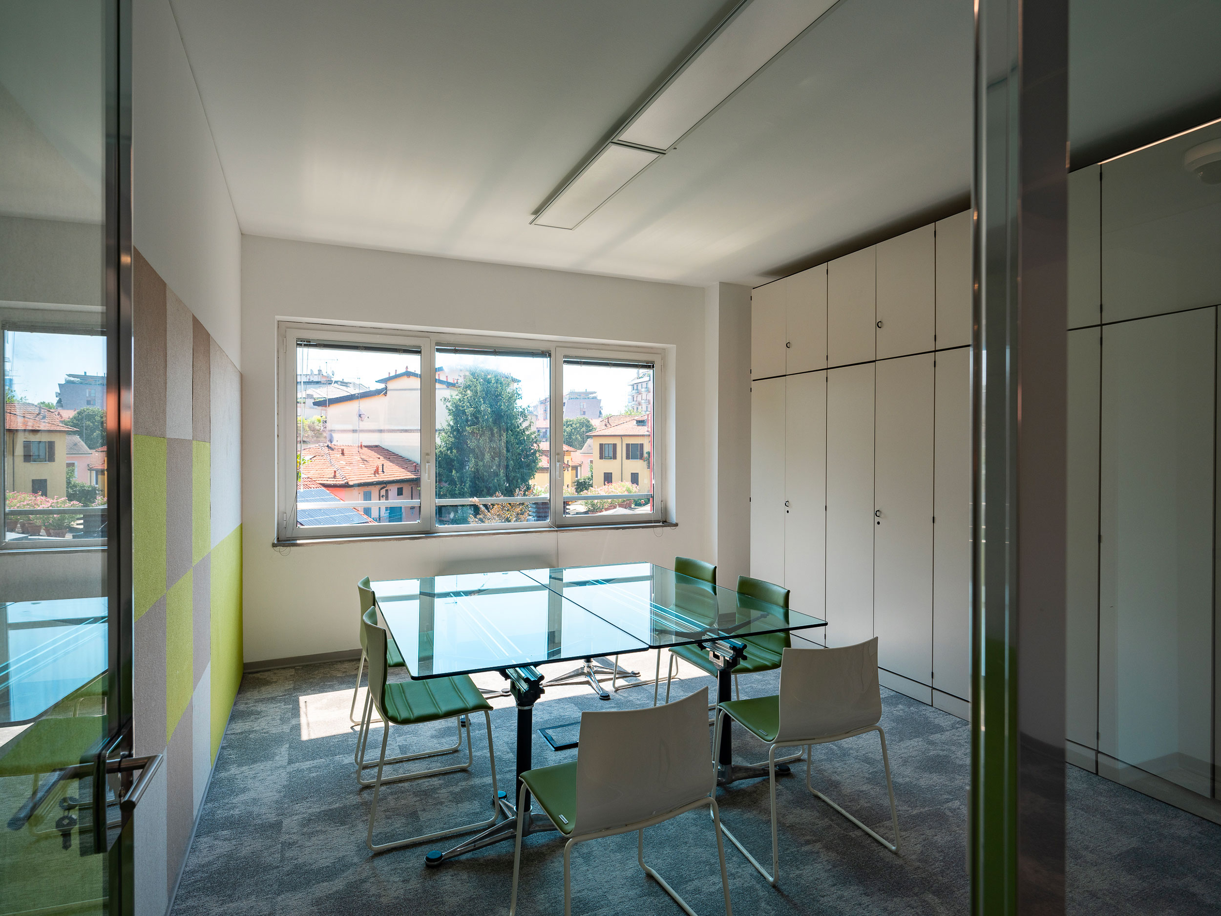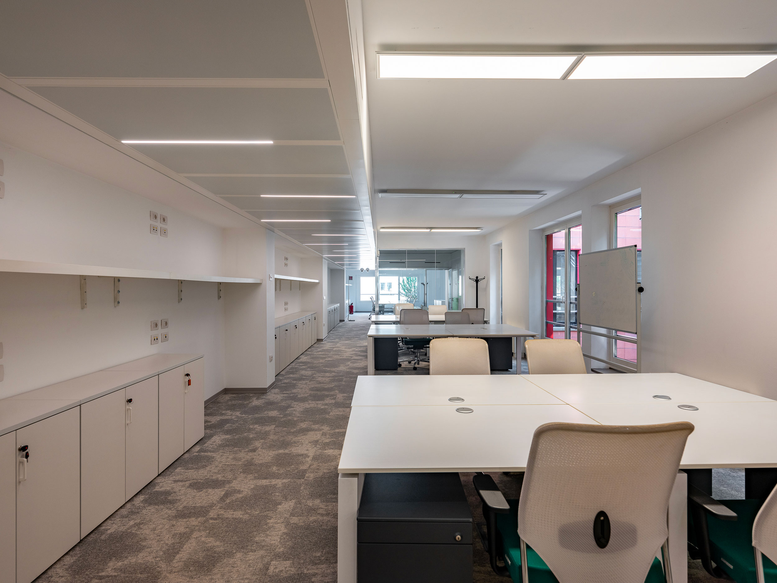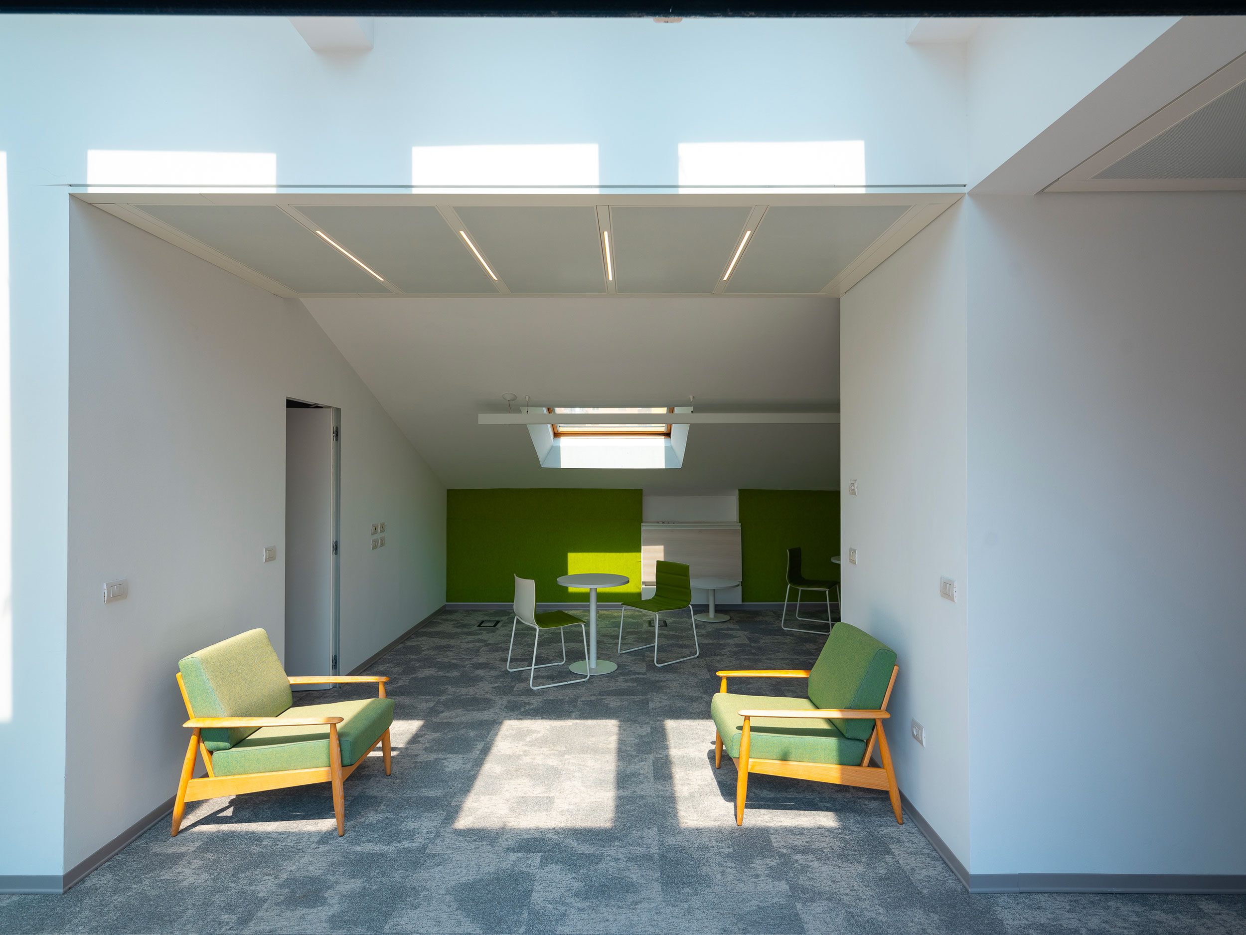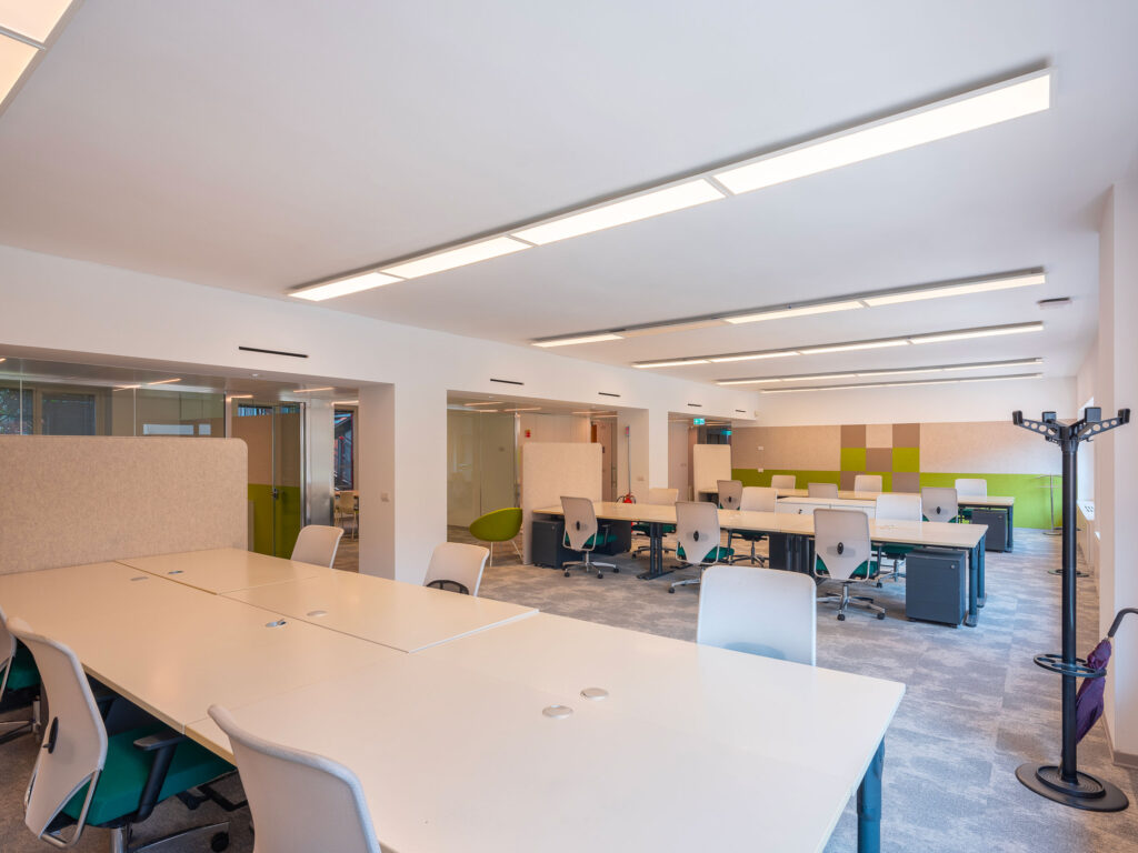 Arredi informali incentivano l’utilizzo creativo degli ambienti che sono dotati di impianto di condizionamento, pavimenti sopraelevati e postazioni cablate per telefonia e dati.