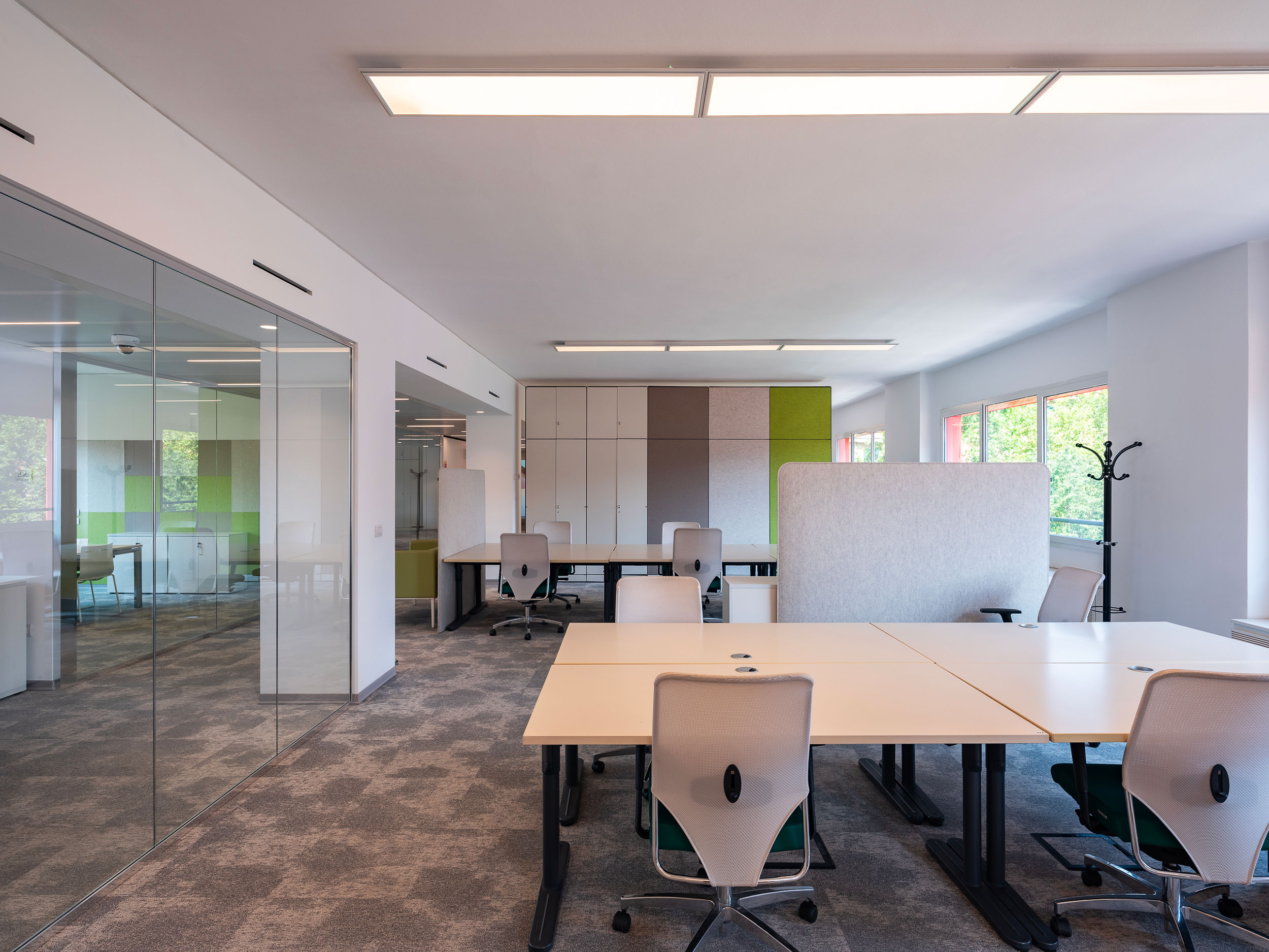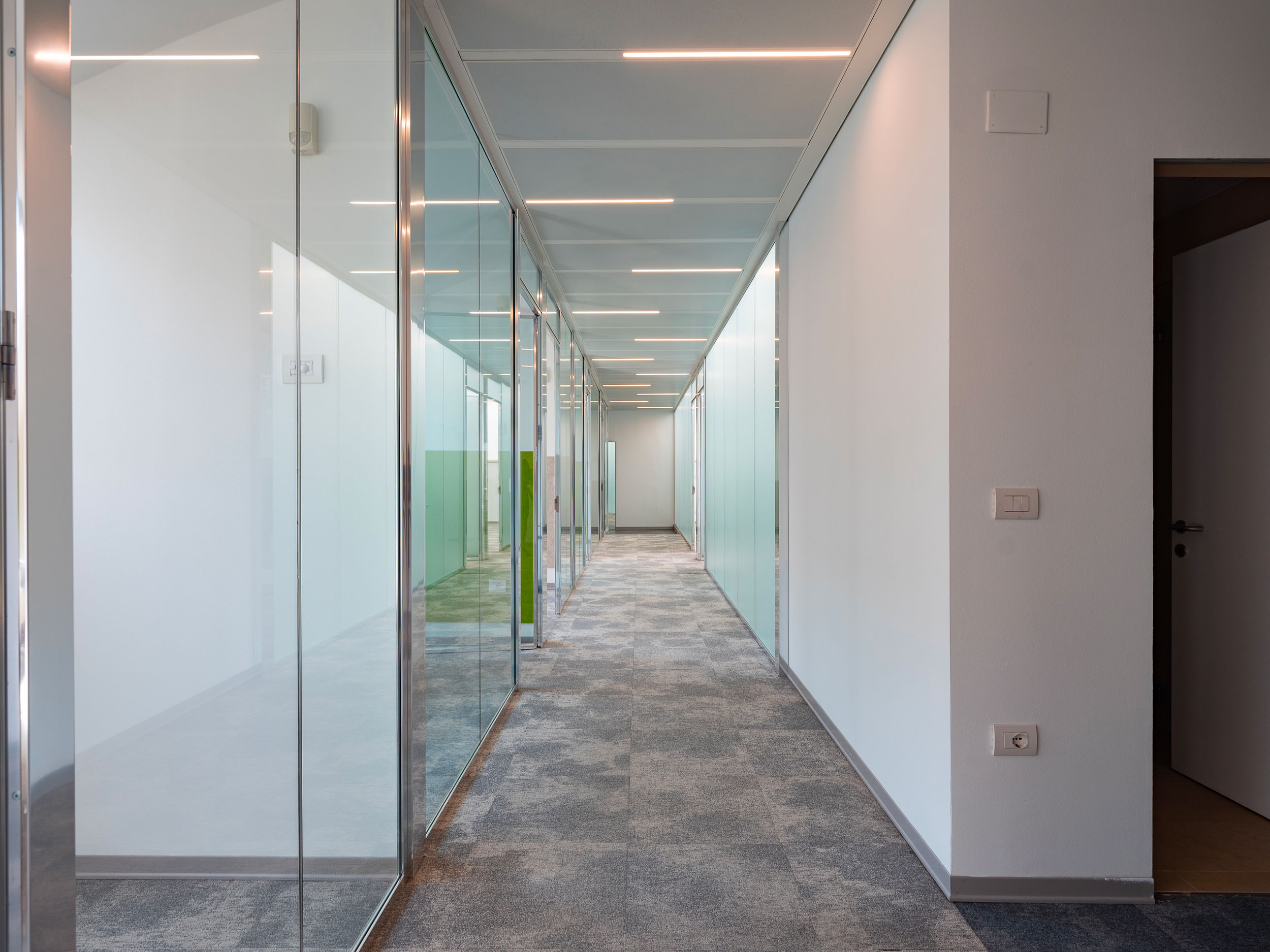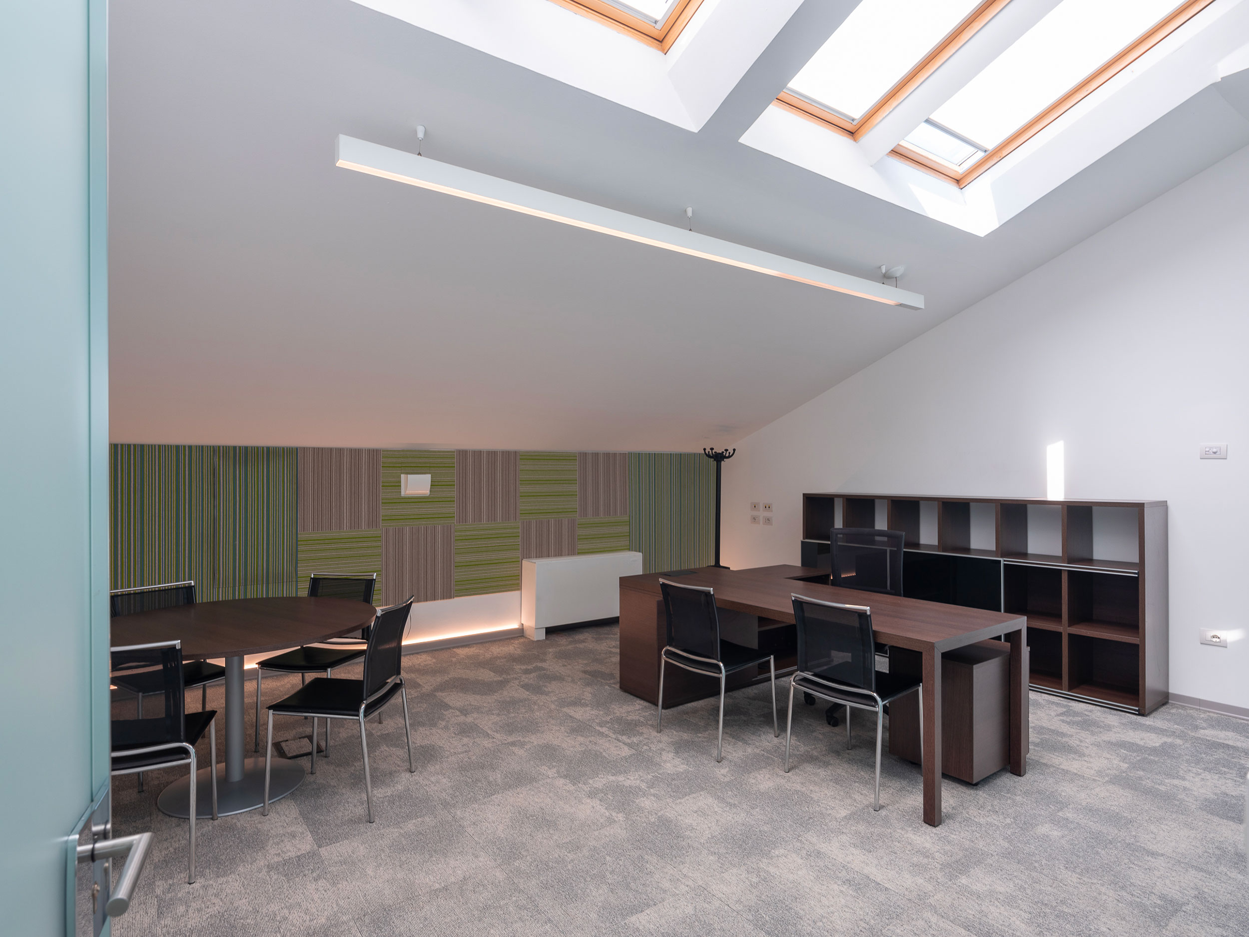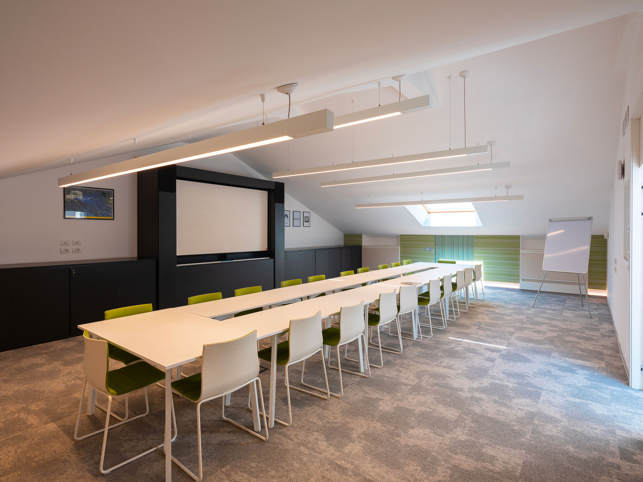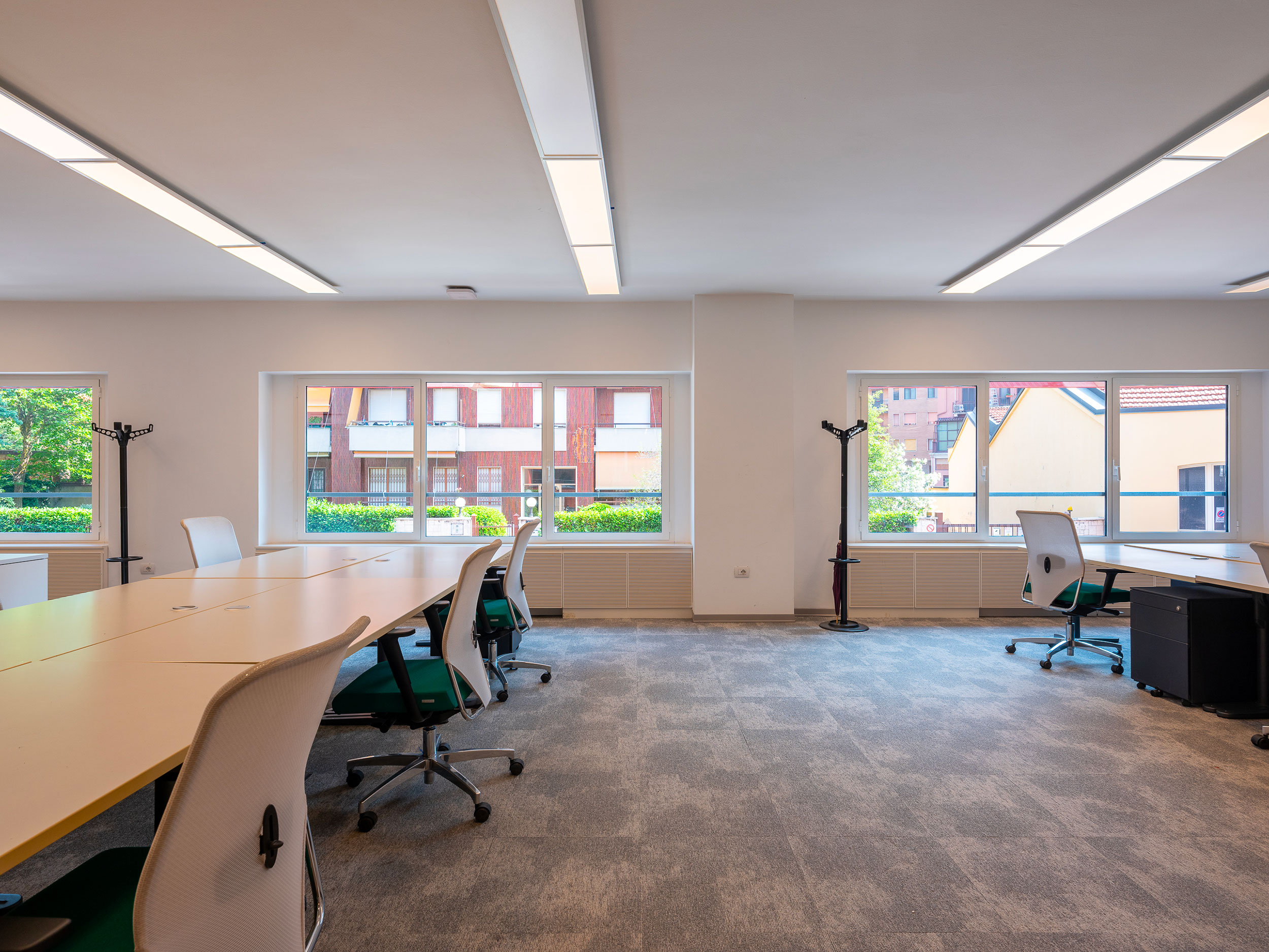 Arredi informali incentivano l’utilizzo creativo degli ambienti che sono dotati di impianto di condizionamento, pavimenti sopraelevati e postazioni cablate per telefonia e dati.