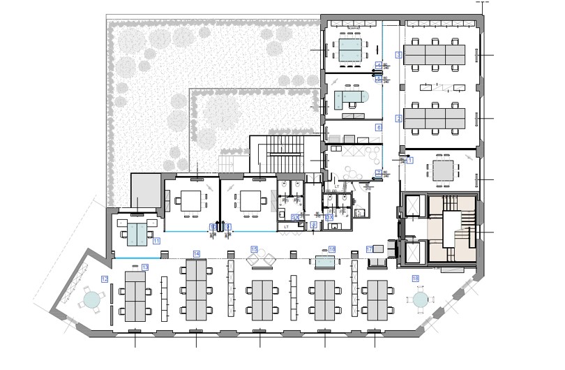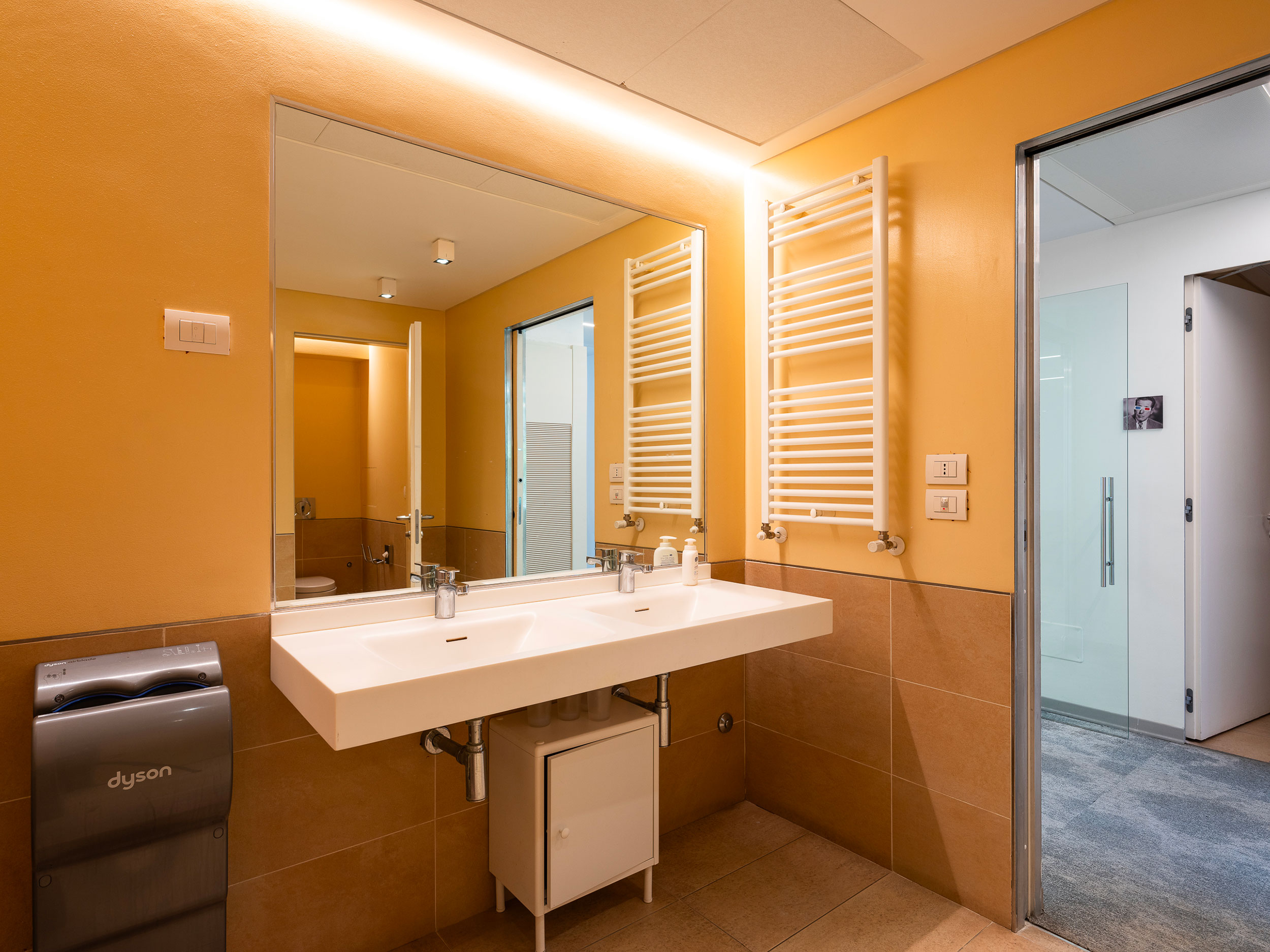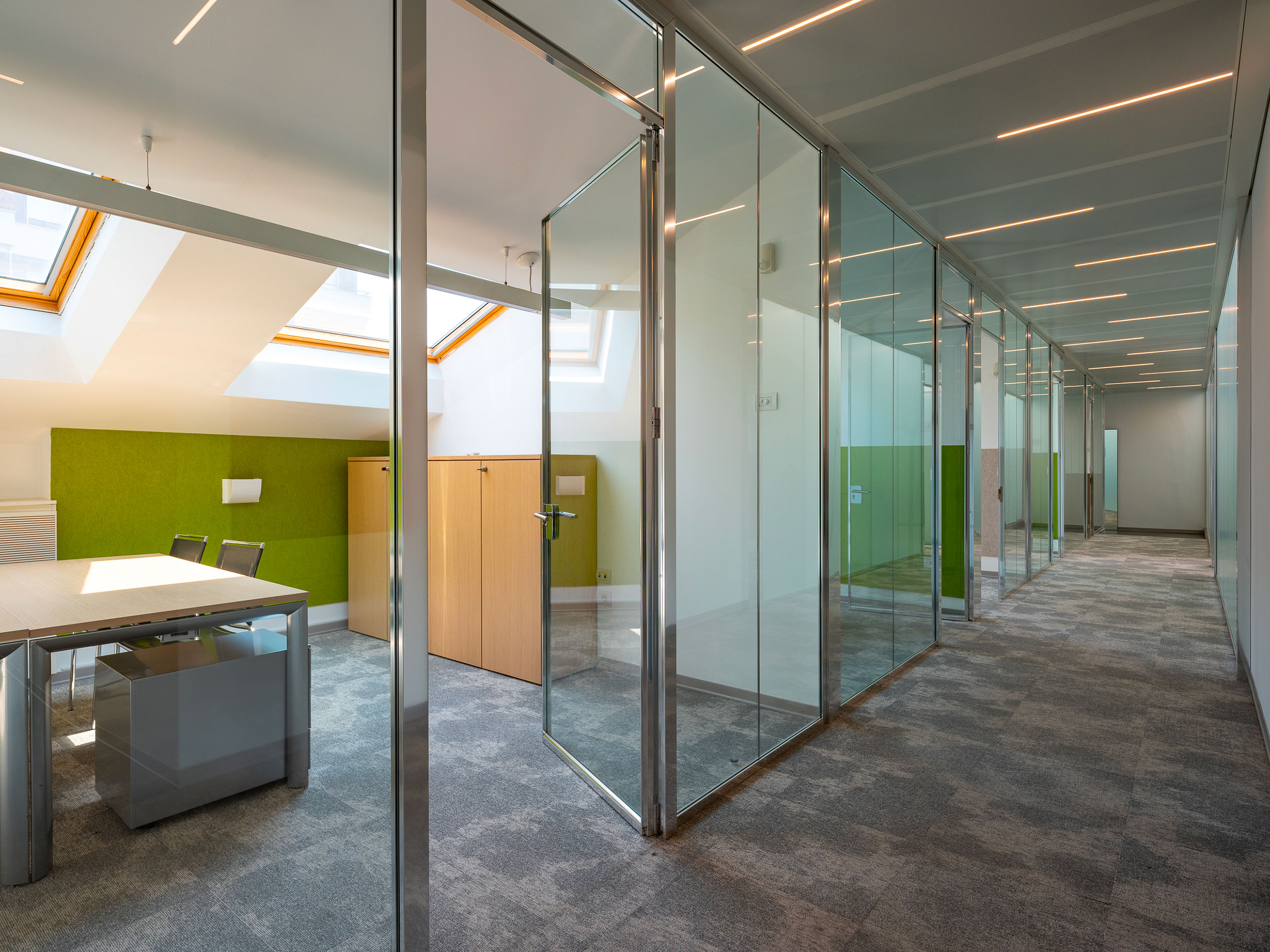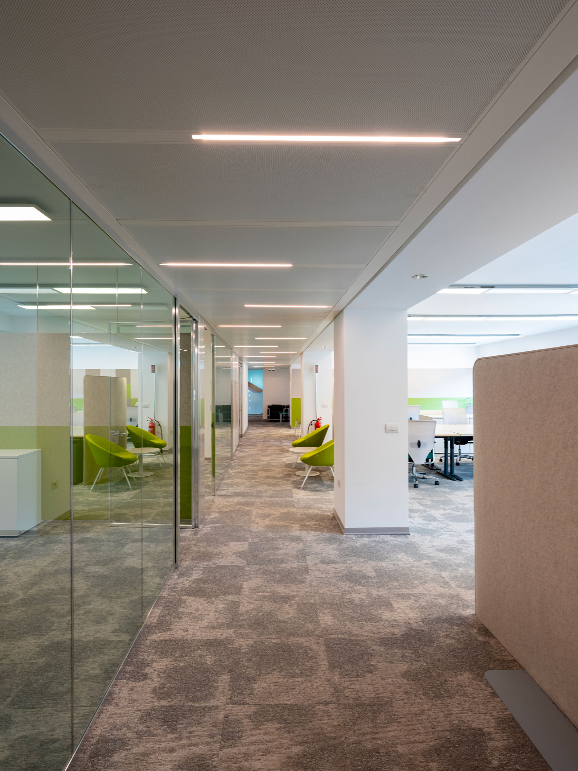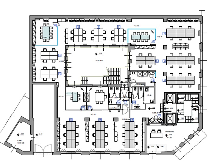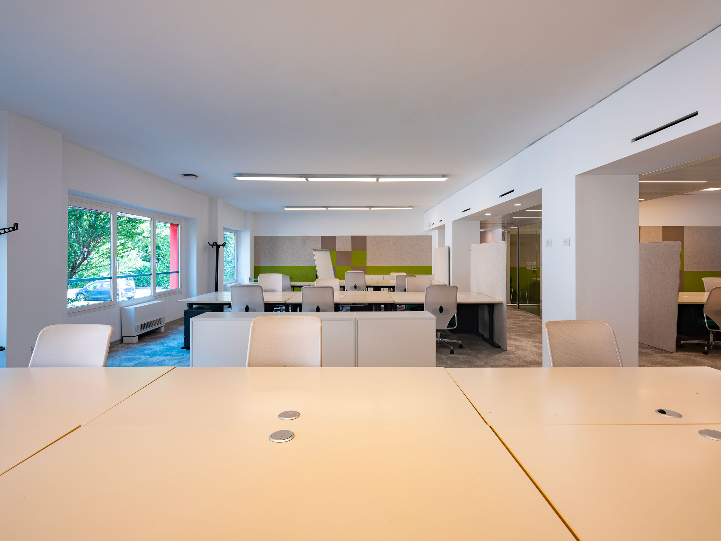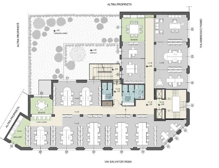 Arredi informali incentivano l’utilizzo creativo degli ambienti che sono dotati di impianto di condizionamento, pavimenti sopraelevati e postazioni cablate per telefonia e dati.
